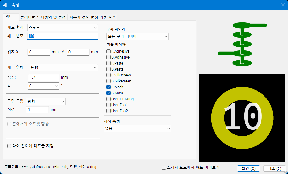 스루홀, 원형, 패드 직경과 구멍 직경을 설정합니다.