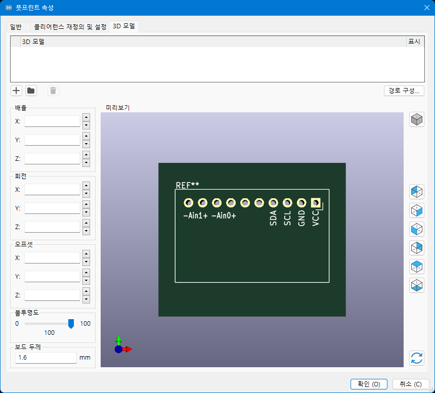 풋프린트 속성 버튼을 누릅니다. 또는 배경의 검정 영역을 더블클릭 합니다.