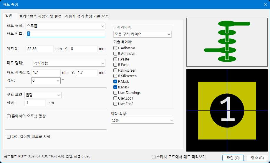 스루홀, 원형, 패드 직경과 구멍 직경을 설정합니다.