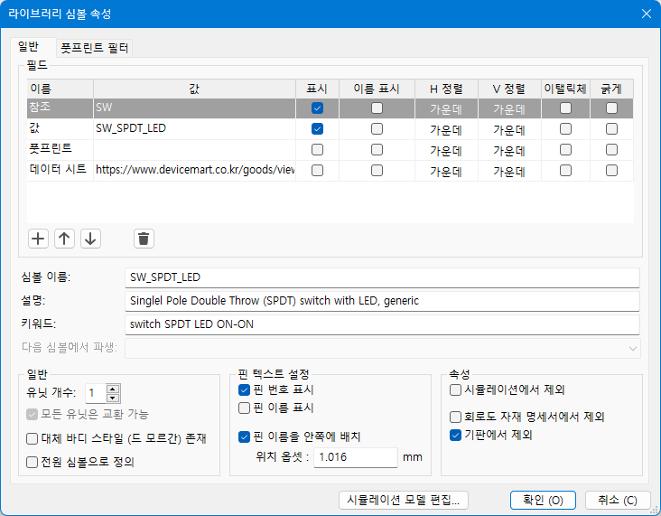 PCB용 부품이 아니므로 풋프린트는 비워두고, 기판에서 제외 항목을 ☑️선택합니다.