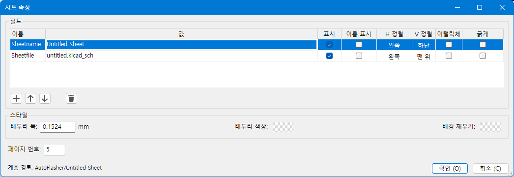 시트 속성 창이 나타나며, 시트 이름과 파일명을 지정하면 됩니다.