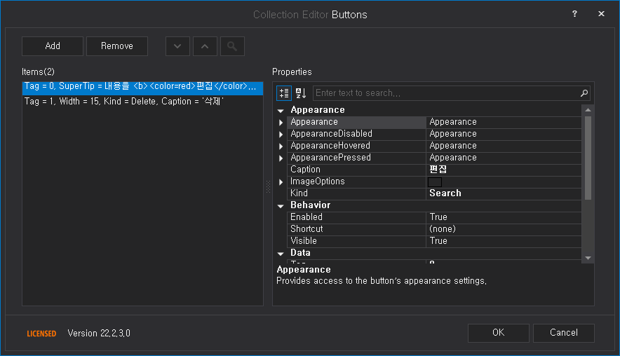그다음 ColumnEdit.Buttons 항목에서 ... 버튼을 누르면 아이템을 추가할 수 있는 창이 나타난다.