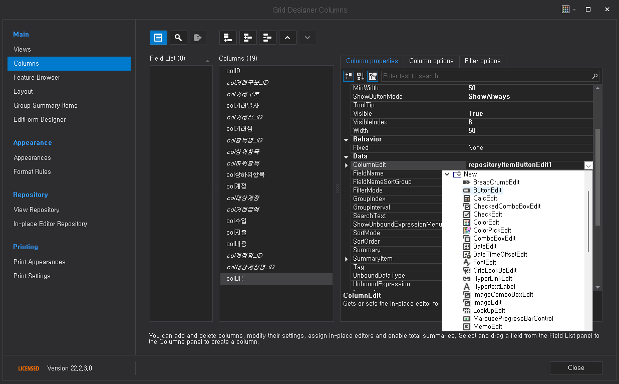 그다음 ColumnEdit.Buttons 항목에서 ... 버튼을 누르면 아이템을 추가할 수 있는 창이 나타난다.