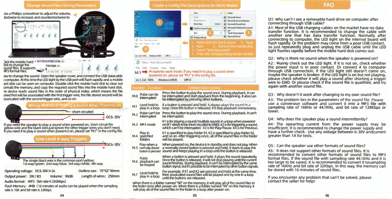 - 장사 멘트처럼 여러 가지 사운드를 연속 재생하려면 M.7 모드를 사용하거나, 6개를 초과할 때는 M.4 모드를 사용하고 해당 폴더에 사운드 파일들을 넣으면 됩니다.