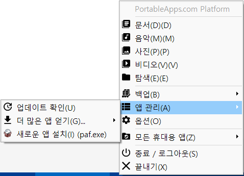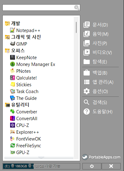 - PortableApps.com 메뉴 - 플랫폼과 함께 번들로 제공되는 통합 시작 메뉴