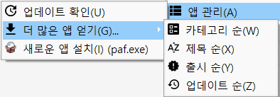 앱 또는 시스템 트레이 아이콘에서 앱 관리 메뉴에서 업데이트 확인은 설치된 앱의 최신 버전을 자동으로 내려받는 기능이다.