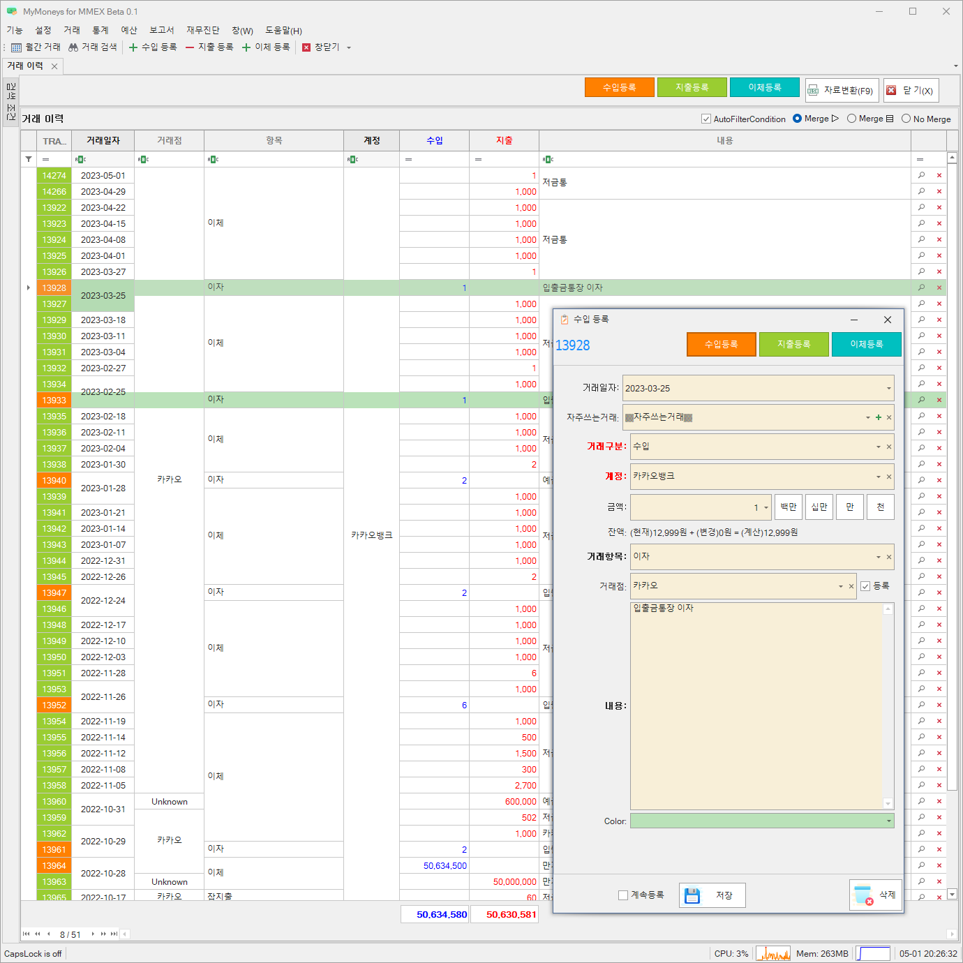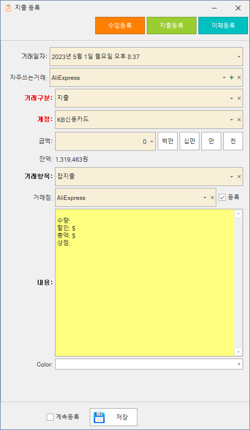 MMEX에는 없고 C# 가계부에 있는 기능 중 하나가 자주쓰는 거래 선택 기능이다.