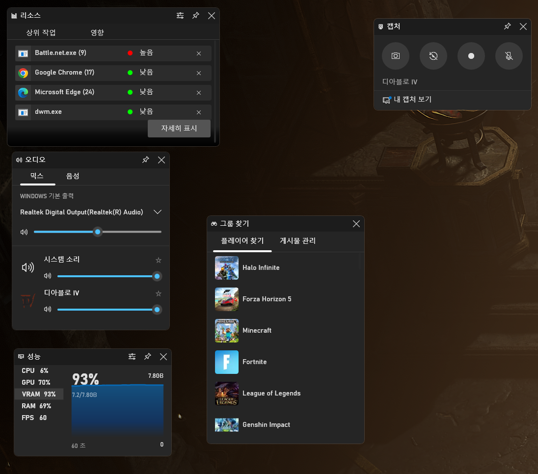 비슷한 게임 내용을 사골처럼 우려먹는 디아블로라서 그런지 IV는 2023년 최신 게임인데도 상당히 부드럽고 고급 사양을 필요로 하지 않는다.