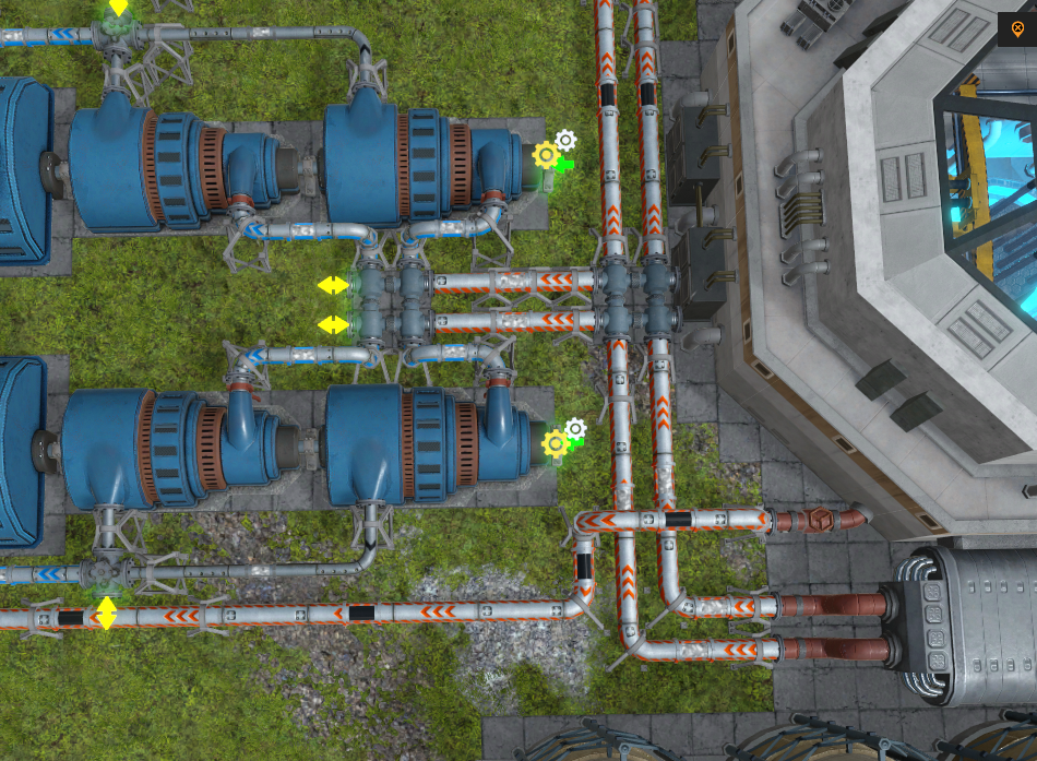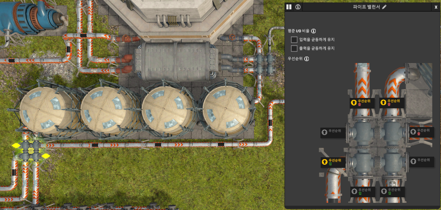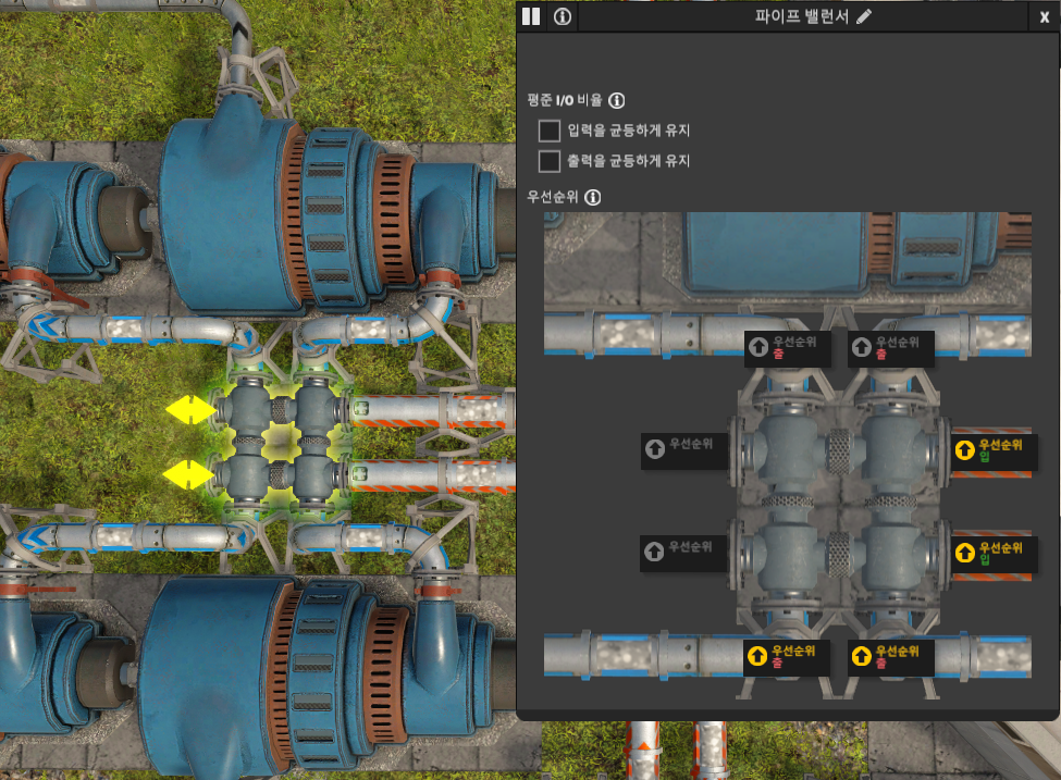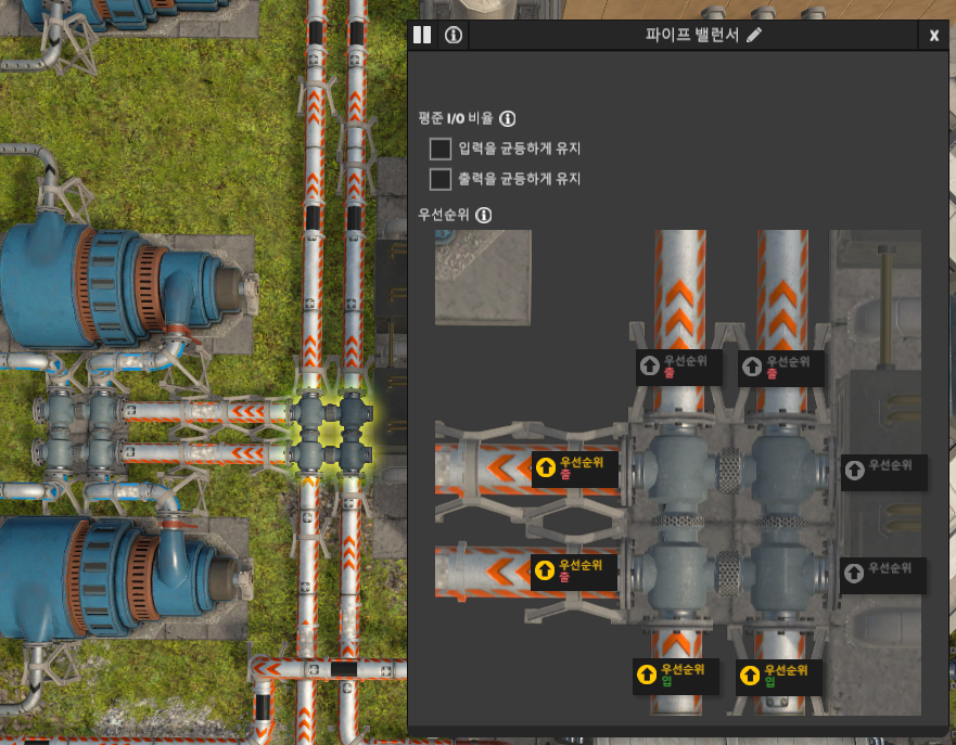 고압 터빈 II는 48의 증기(고압)를 입력받는다. 전력 수준 1X의 증기(고압)는 96이므로, 첫 줄의 고압 터빈 II가 우선적으로 증기(고압)를 입력받아야 한다. 파이프 밸런서의 증기 출력 우선순위를 위 그림과 같이 설정한다. (입력 우선순위는 필요 없음)