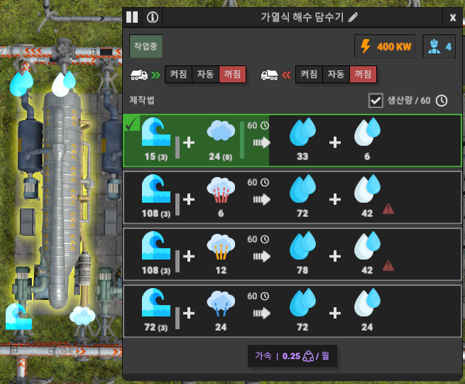 냉각탑에 무압 96을 넣으면 물이 72 만큼 나오고, 담수기에 무압 94를 넣으면 물이 132 만큼 나온다.