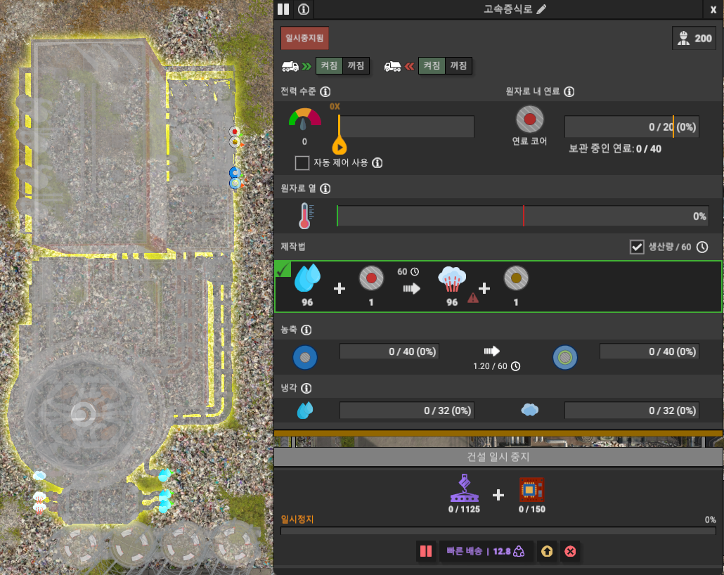 우라늄 광석 보관소 II 1개 ➡️ 분쇄기 1개 ➡️ 침전조 1개 ➡️ 농축 공장 1개, 유독성 현탁액 보관소 1개, 고갈된 우라늄 보관소 1개 ➡️ 조립동(전기) II 1개 ➡️ 우라늄 연료봉 보관소 II 1개면 충분하다. 우라늄 정광 보관소는 필요가 없는데, 우라늄 연료봉 보관소는 있어야 한다.