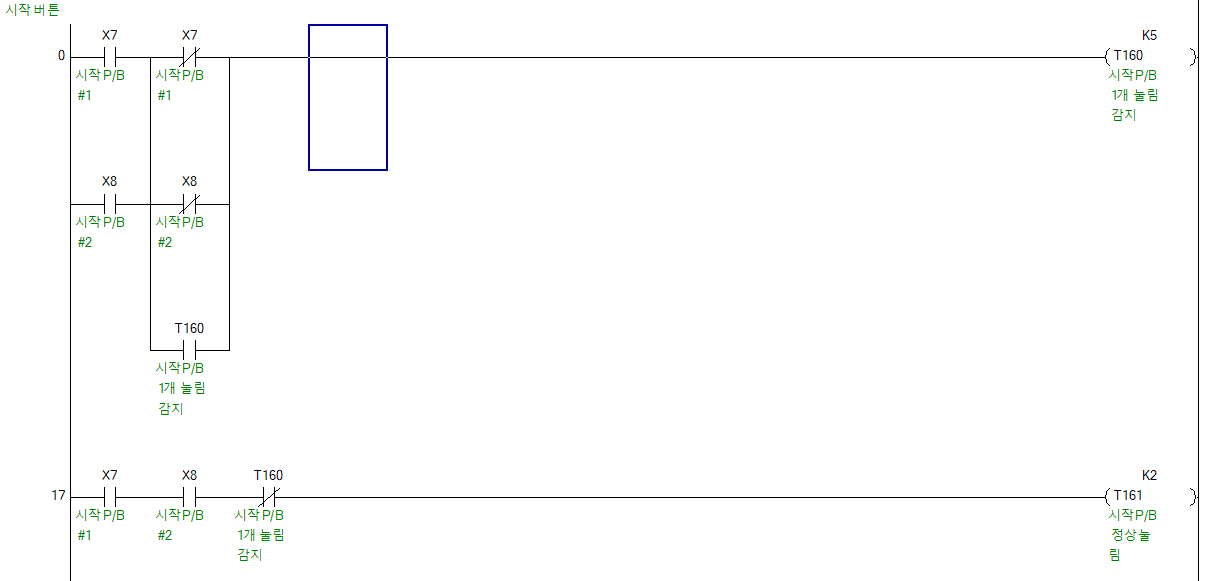 만약, X7이 눌린 채 0.5초 후에 X8이 눌리면 첫 번째 타이머(T160)의 A 접점이 켜져 있으므로 두 번째 타이머(T161)는 동작하지 않을 것이다.