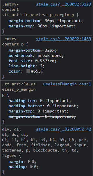 이 코드가 문단 공백을 없애버린 것이다. 그것도 important 하게.