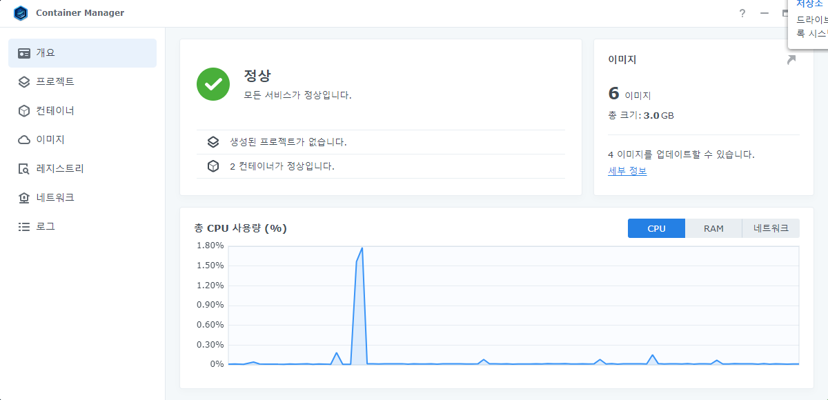 개요 탭에서는 실행 상태와 리소스 정보를 보여줍니다.