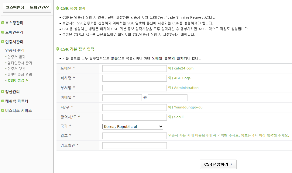 CSR은 sslcert 사이트에서 생성해도 되지만, 여기서는 카페24에서 생성해 본다.