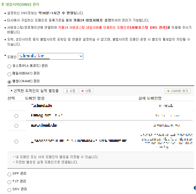 인증서를 설치할 도메인을 선택하고, 별칭(CNAME) 관리를 선택한다.