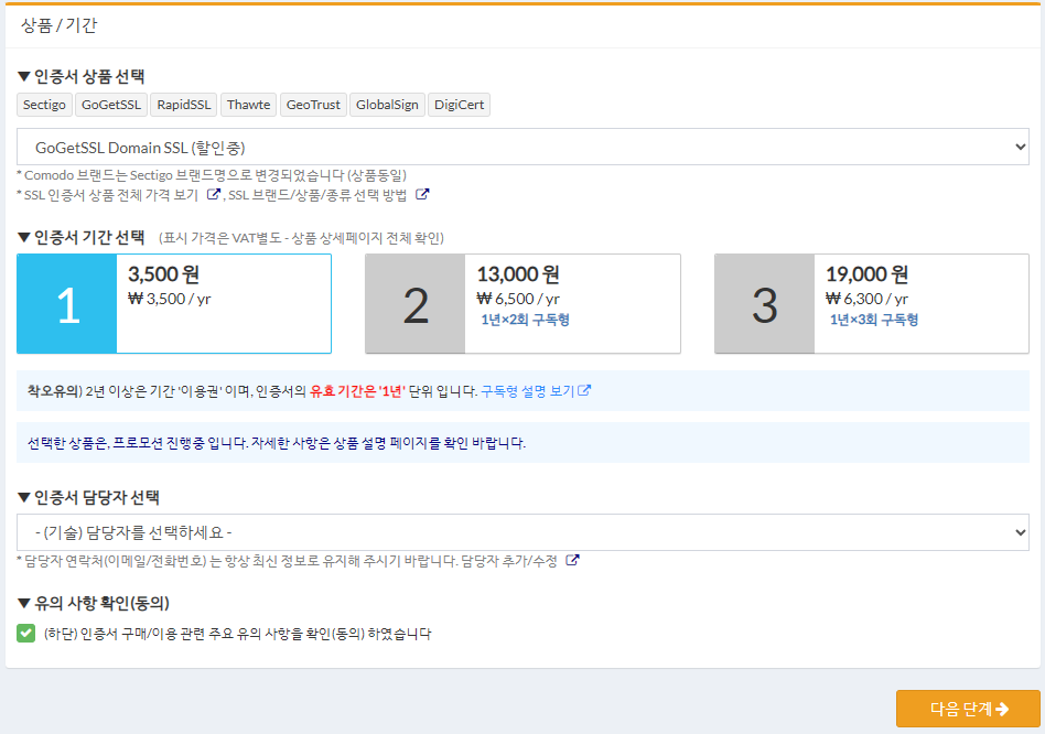 GOGETSSL 상품을 선택하면 할인 중인 항목이 보인다. 1년에 3,500원!!!