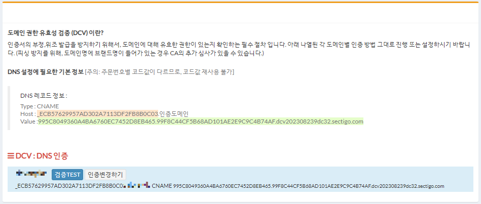 다시 SSLCERT 사이트로 이동 후, DCV : DNS 인증에서 검증TEST 버튼을 누른다.
