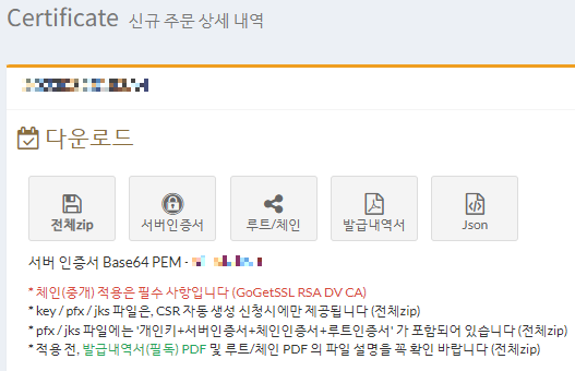 주문 상세 페이지에서 서버인증서 버튼을 누른다. 그러면 .crt.pem 파일을 내려받을 수 있다.
