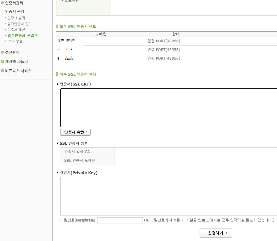 인증서관리 - 외부인증서 관리 항목을 클릭한다.