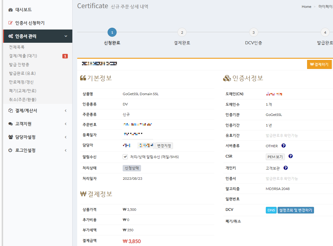 SSLCERT 사이트에서 인증서 주문 상세 페이지로 이동한다.
