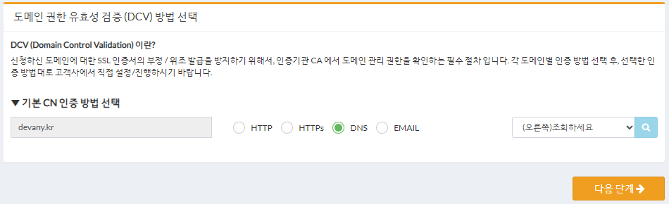 도메인 권한 유효성 검증 (DCV) 방법 선택