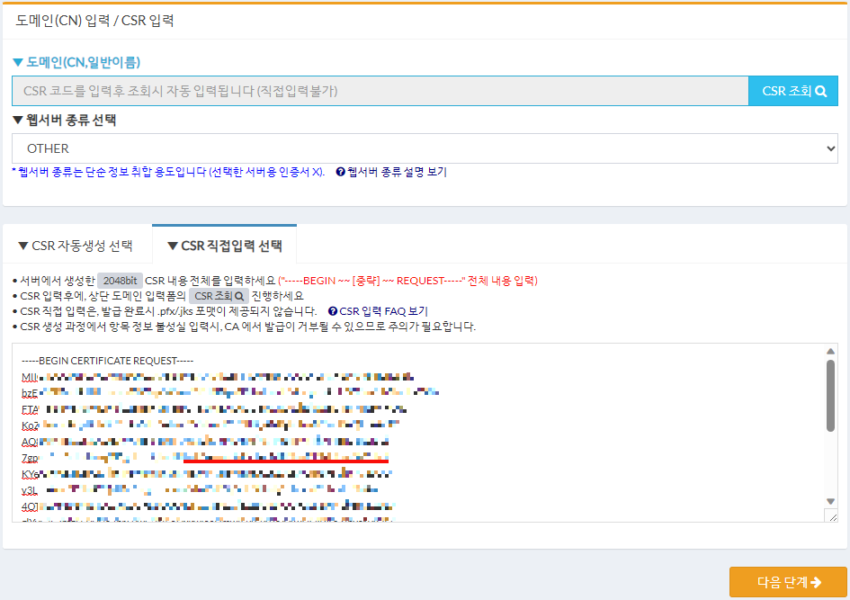 CSR 직접입력 선택 탭을 누르고 입력 박스에 ssl.csr 파일 내용을 붙여 넣는다. ssl.csr 파일 내용은 방금 전 열어놓은 텍스트 편집기에 있다.
