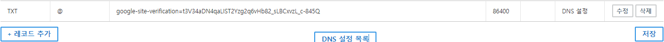 레코드 타입은 TXT, 호스트는 @, 값에는 구글 페이지에 있는 코드를 붙여넣고 저장을 하면 즉시 적용된다.