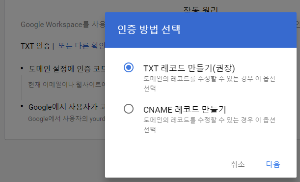 다음 버튼을 눌러서 나오는 안내 페이지에 따라 TXT 레코드 인증을 하면 된다.