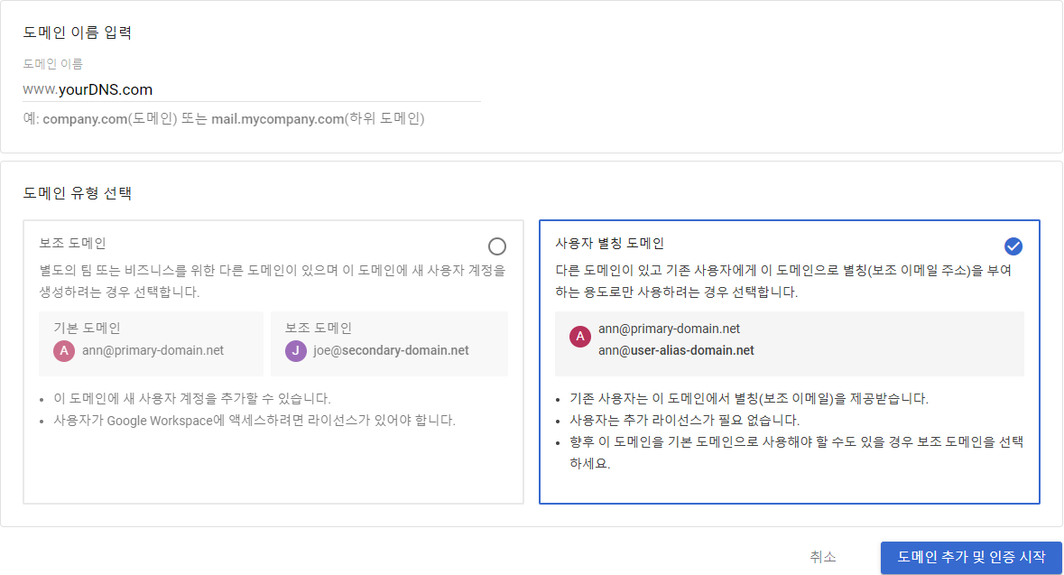 기존 계정에 도메인만 추가하는 것이므로 사용자 별칭 도메인을 선택한다.