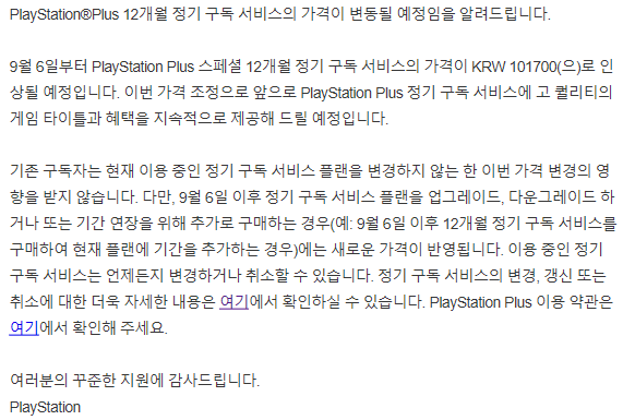 PS+ 구독 서비스 변경 알림