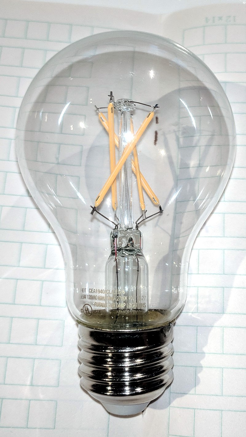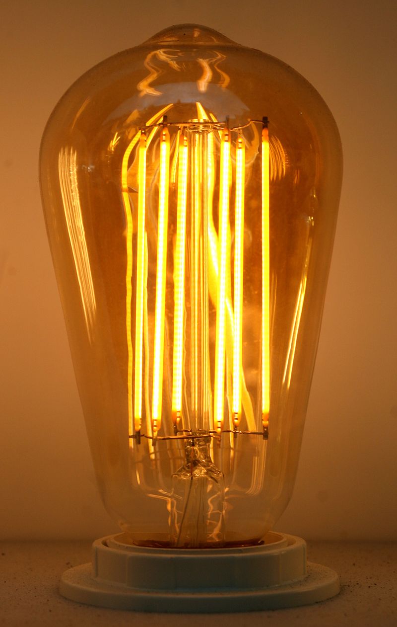 위 사진의 전구는 LED이고 필라멘트이다. LED를 길게 붙여서 필라멘트로 만든 전구이다. 형태만 보고 LED와 텅스텐을 구분하면 안 되는 것이다. LED의 발광면 때문에 여러줄의 필라멘트로 만들어서 360도로 일정한 광도를 만들어낸다.