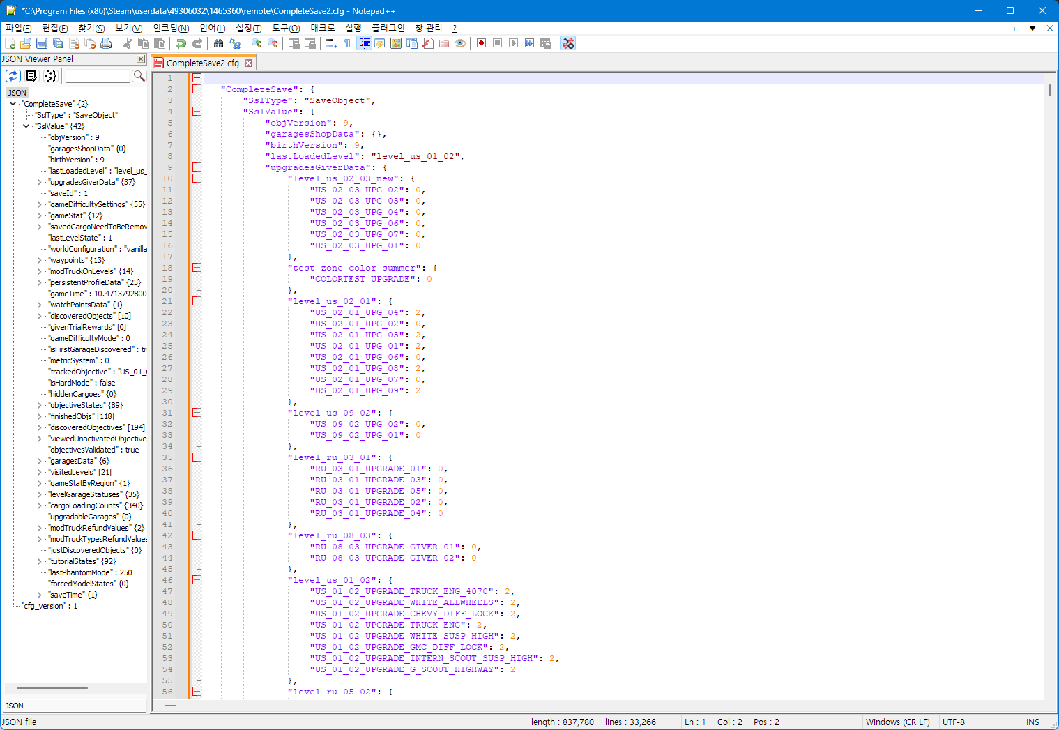 처음 JSON 파일을 열면 여전히 한 줄로 표시되고, 왼쪽에 JSON 트리 목록이 나타난다.