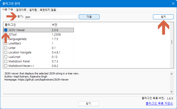 플러그인 관리 창이 나타나면 JSON Viewer 항목을 찾아서 설치한다.