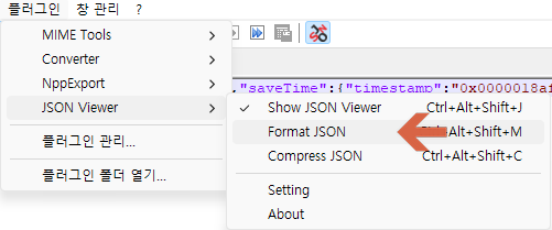 주 메뉴 - 플러그인 - JSON Viewer - Format JSON 항목을 누른다.