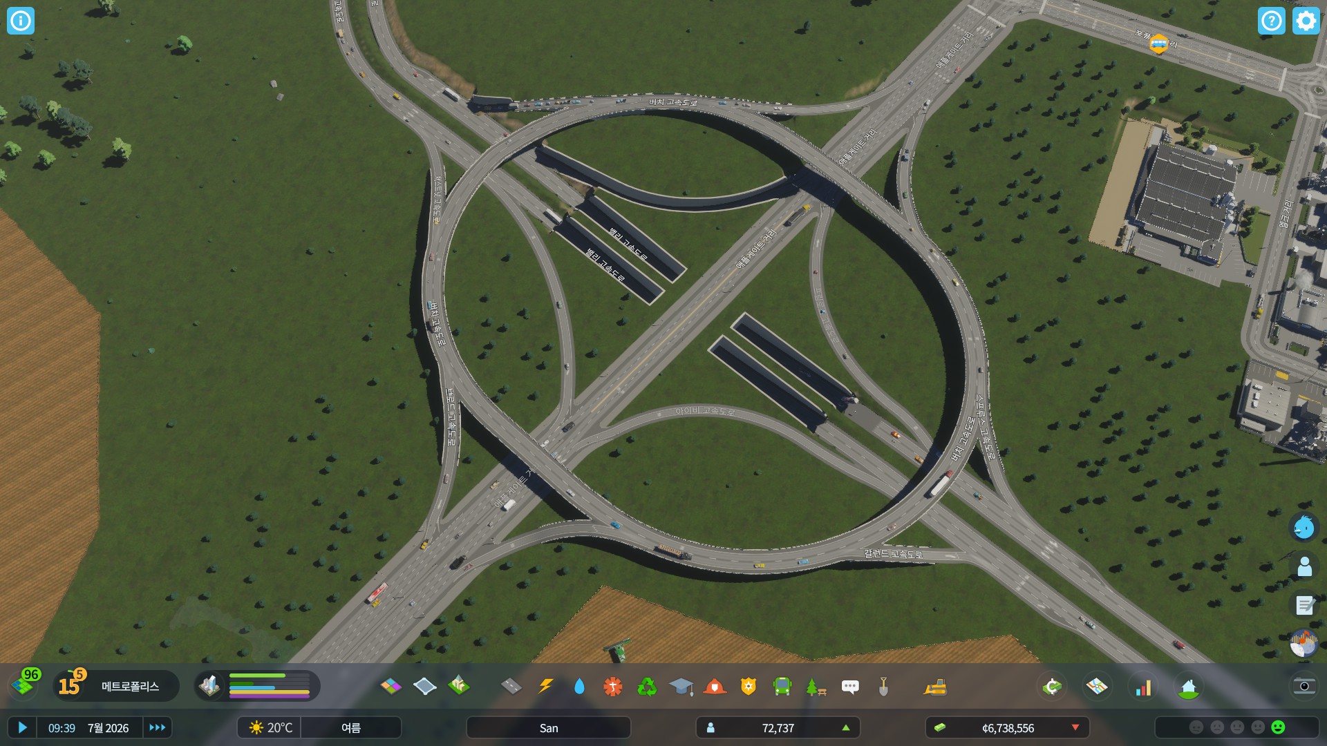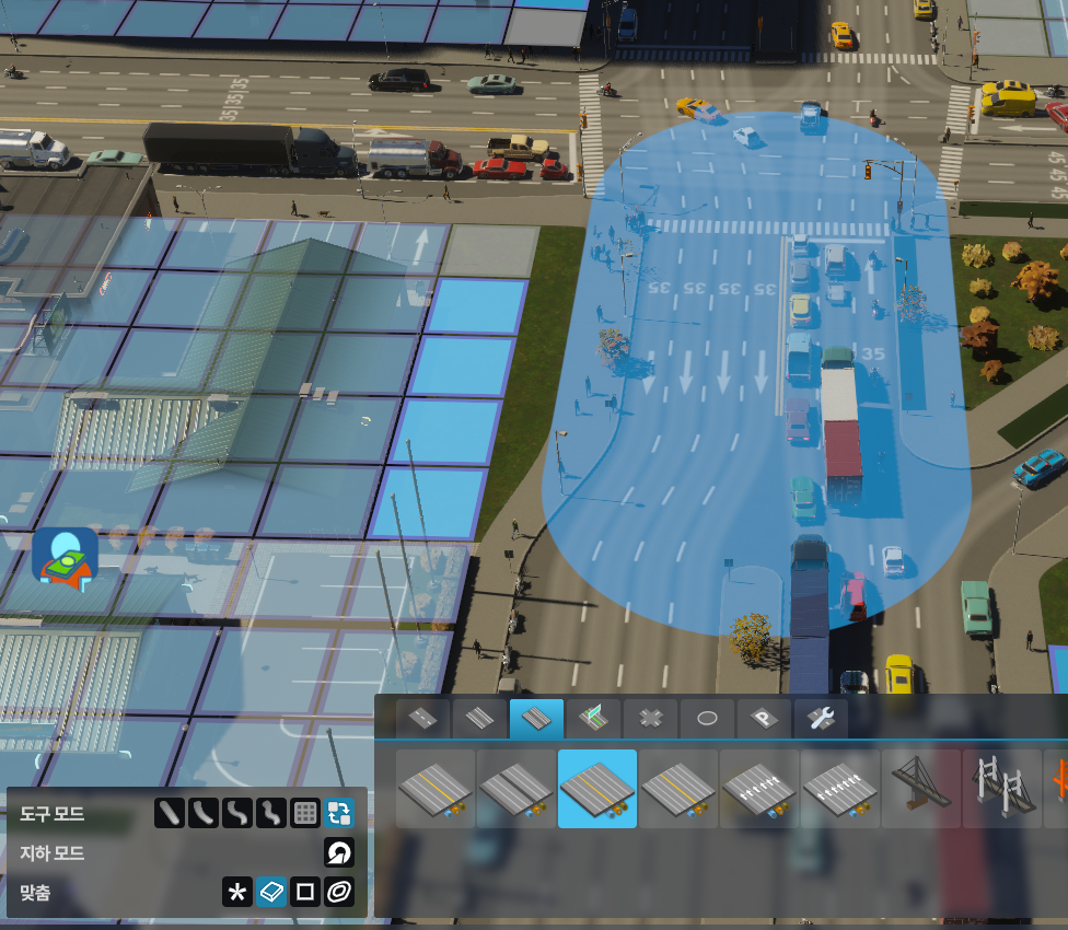 도로를 배치할 때, 기본값은 격자 위치에 맞춰지는데, 기존 지오메트릭 버튼을 체크하면 격자로 배치되며, 구역 칸 길이에 맞추기 버튼을 체크하면 격자 크기에 맞춰서 배치된다. 8차로와 6~7차로의 크기 차이는 격자 한 칸 미만이므로, 세 번째 버튼을 끄고 배치하면 된다.