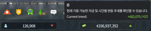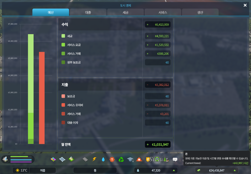 게임 처음에는 항상 적자였고, 보너스로 도시를 유지했는데, 새로 시작한 도시는 우습게 이익을 보고 있다.