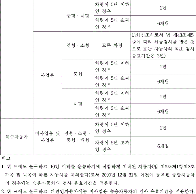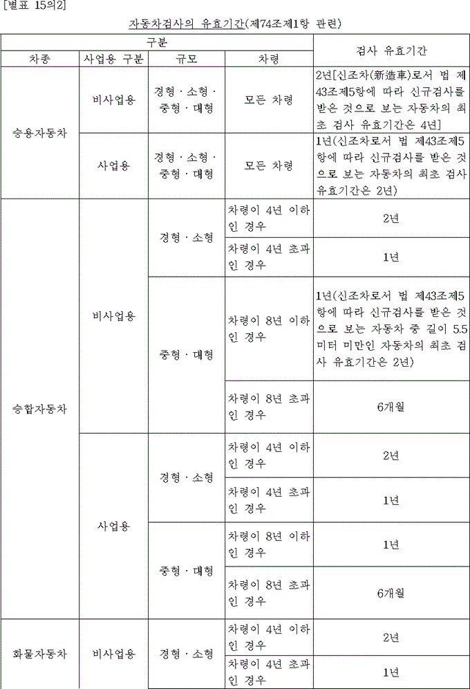 제2조(검사 유효기간에 관한 적용례) 별표 15의2의 개정규정은 부칙 제1조 단서에 따른 시행일 이후 검사를 받는 자동차부터 적용한다.