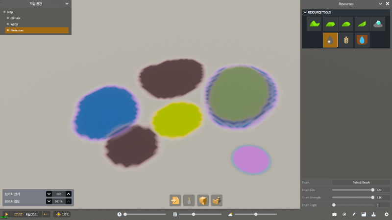 조경 작업이 되고, 물 종류별로 위치와 특성 지정