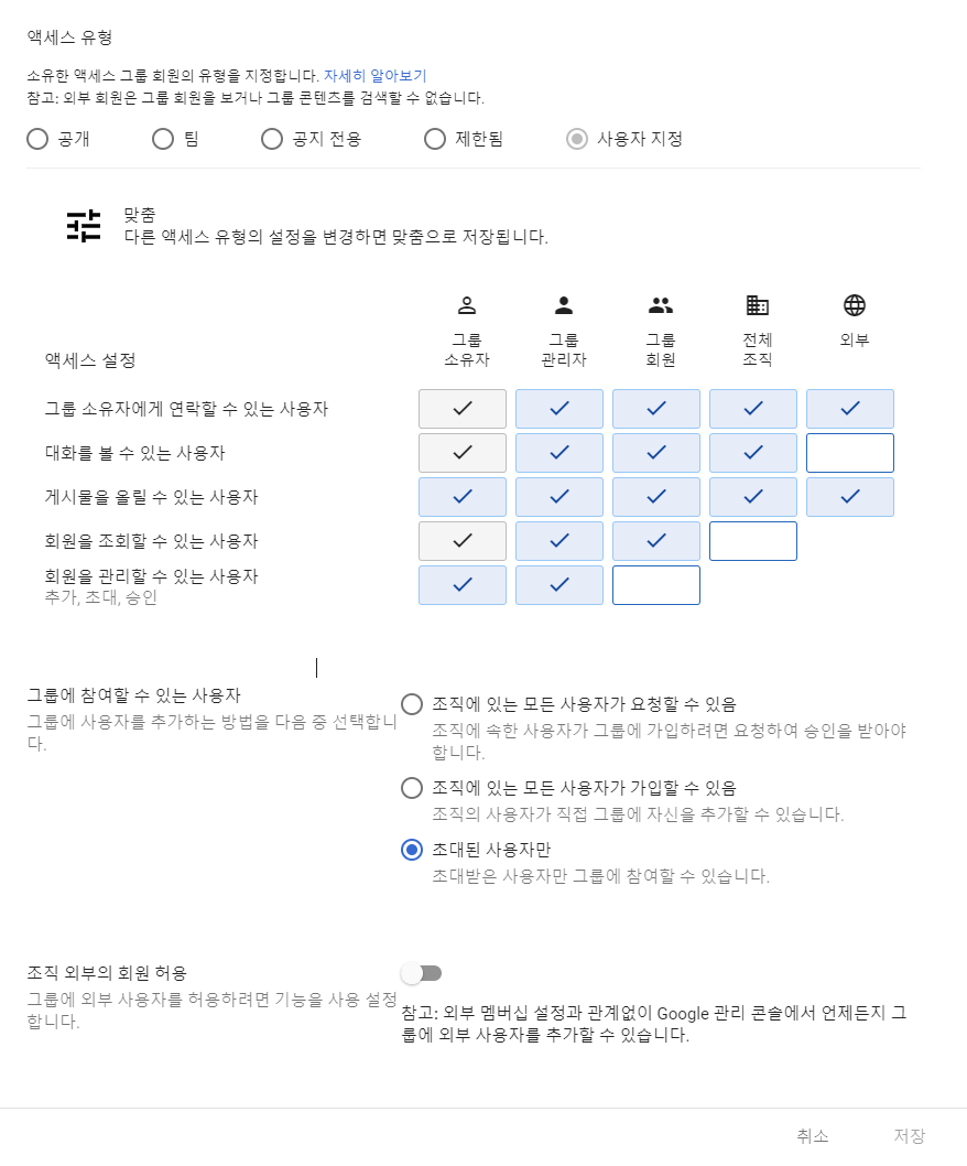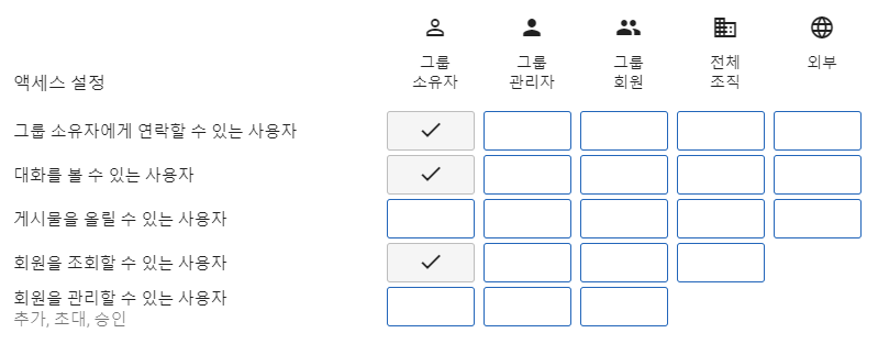 이렇게 설정하면 소유자만이 메일을 주고 받을 수만 있다. 예) 비자금 그룹