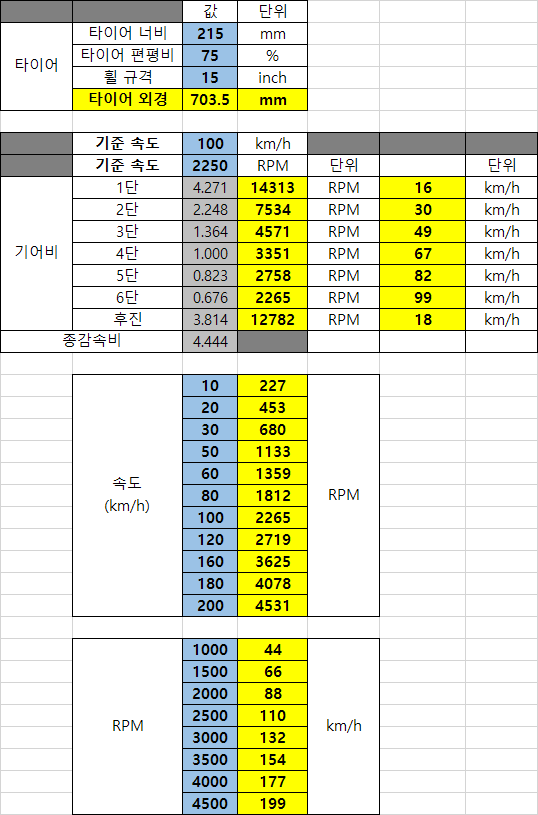 엔진 회전 수 ÷ 1~6단 기어비 ÷ 종감속비 × 타이어 둘레 × 시간 = 시속