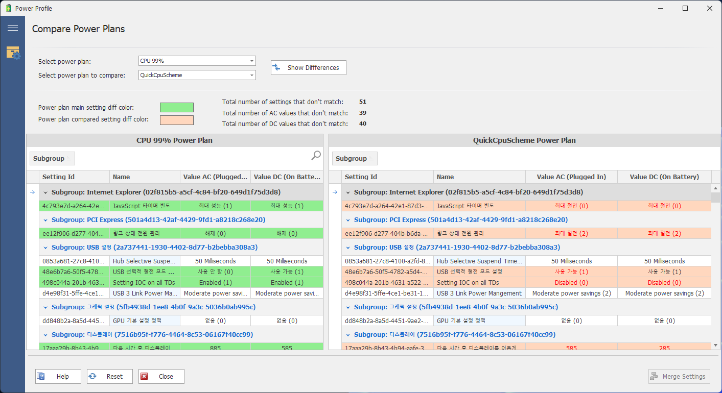각 항목별 설정 창을 통해 다른 전력 계획과 비교하면서 상세한 설정이 가능하다.