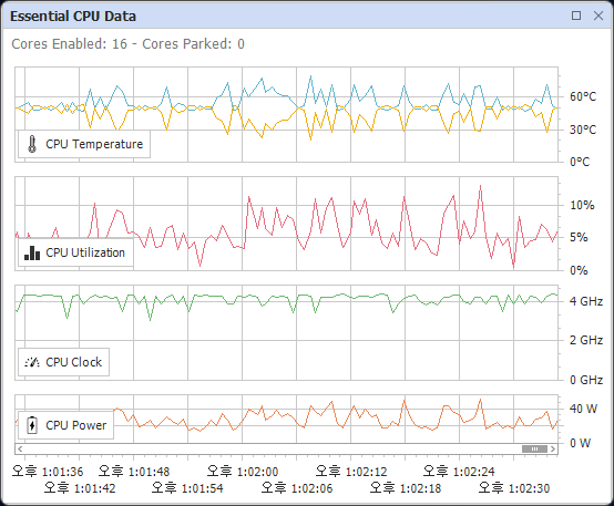 CPU Temperature에서 황색 차트는 TjMax까지 남은 온도값이다. CPU의 최대 온도는 100℃이므로 (100 - 현재온도)로 계산된다.