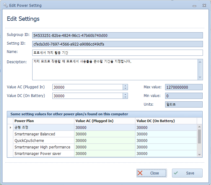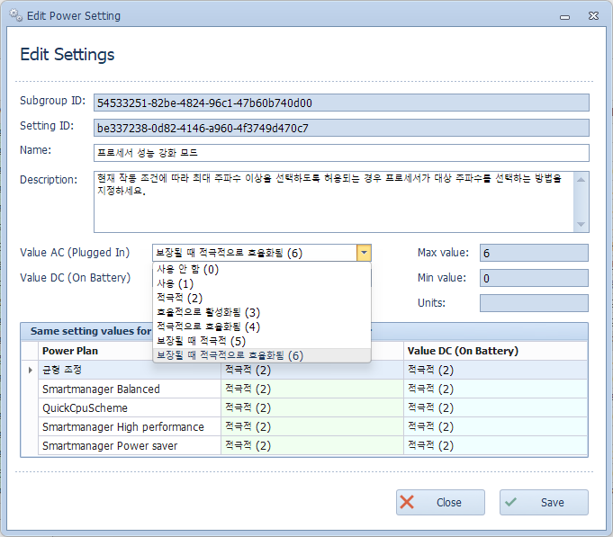 위에서부터 설정 ID, 설정 이름, 설명, 전원 유형별 설정값, 전력 계획별 설정값