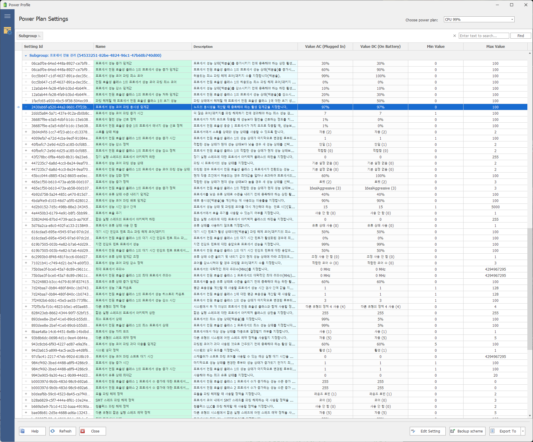 윈도우 전력 계획에서 설정이 불가능한 부분까지 적용된다. (Power Profile 참고)
