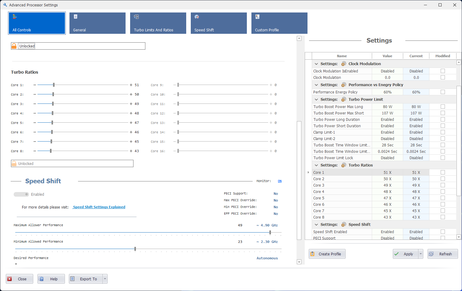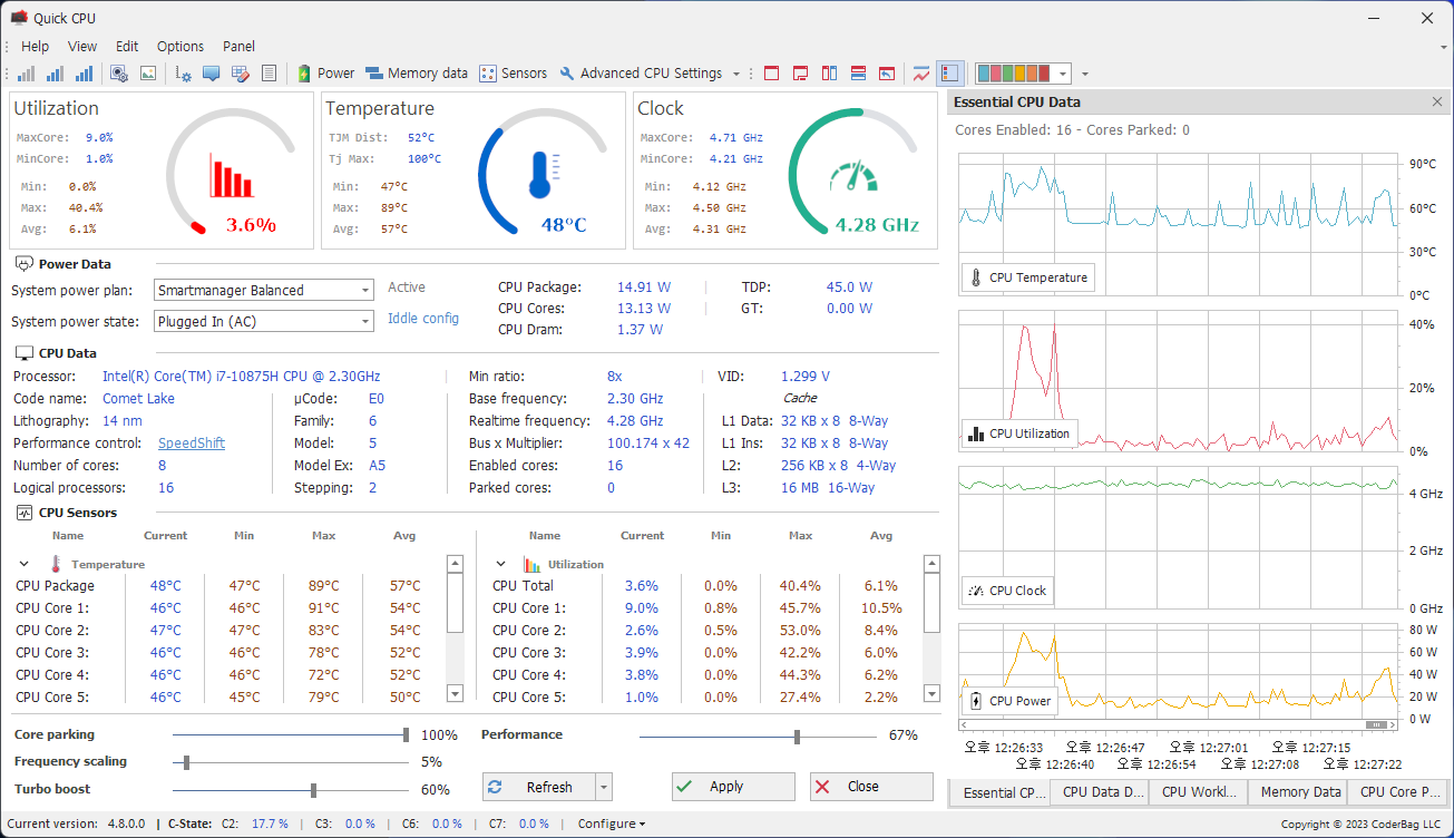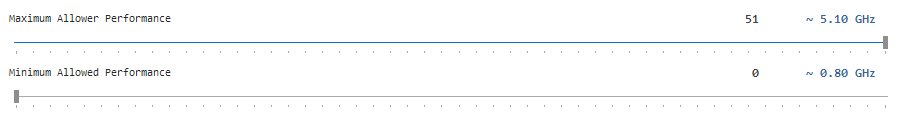 기본 값은 최대 4.9GHz, 최소 2.3GHz인 CPU를 최대 5.1GHz, 최소 0.8GHz로 변경하였다. 사용할 땐 오버클록, 대기할 땐 최소 전력으로 동작한다.