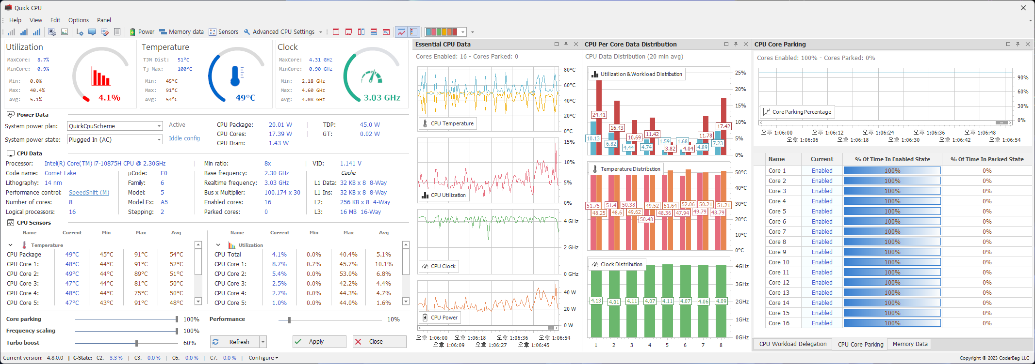 인텔의 Turbo Boost 기능이 있는 CPU는 부하 발생시 클록을 올려버린다. 😤 100% 부하가 아니더라도 CPU는 순간적으로 부스터를 활성화 한다. Intel i7-10875H를 보면 2.3GHz로 동작하던 것이 4.9GHz까지 빨라