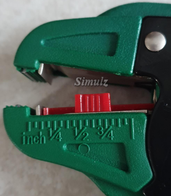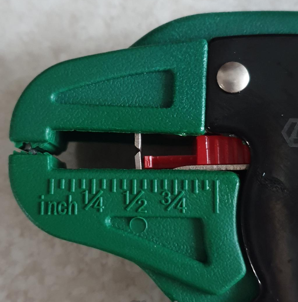 빨간색의 가이드로 벗기고 싶은 피복의 길이를 설정합니다. 눈금 표시가 mm가 아닌 것이 매우 아쉽습니다.