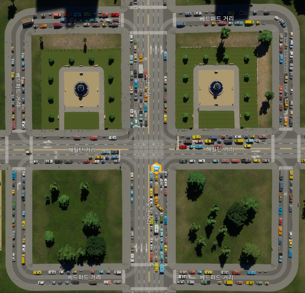 중심 교차로와 위성 교차로 4곳은 직진과 우회전만 가능하도록 설정한다. 그리고 위성 교차로는 신호등을 없앤다.