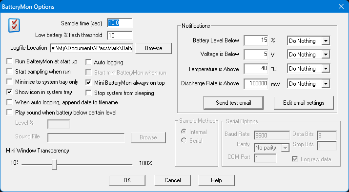 프로그램과 이메일 알림 설정을 할 수 있습니다. 시리얼 포트가 없어서 통신은 비활성화 되어 있습니다.